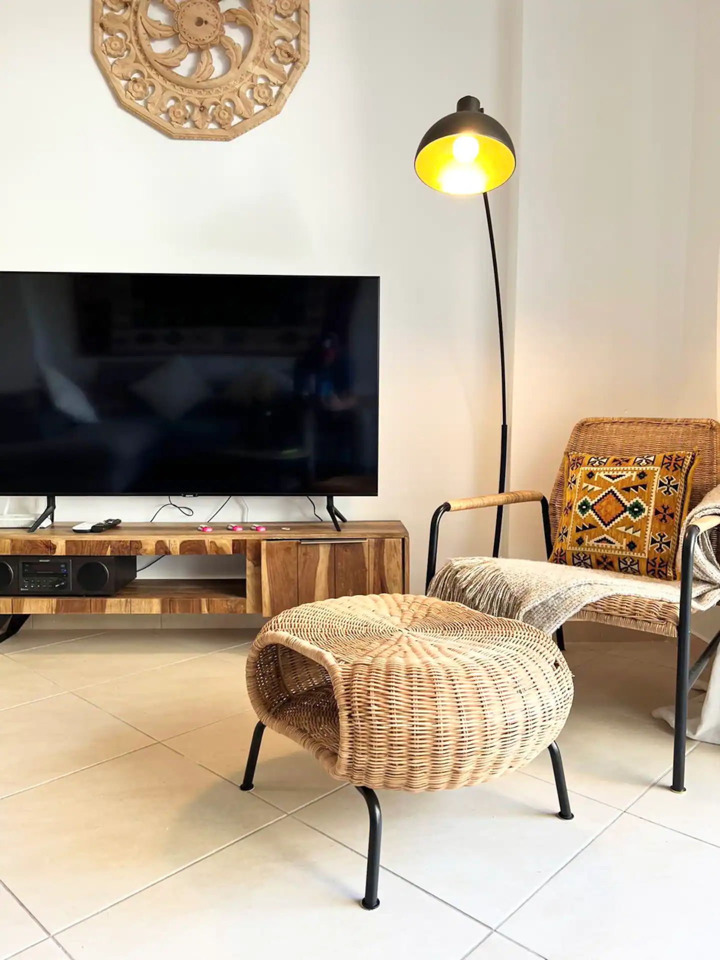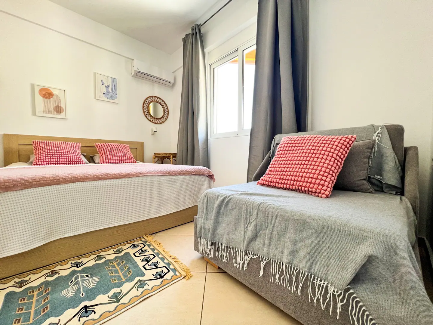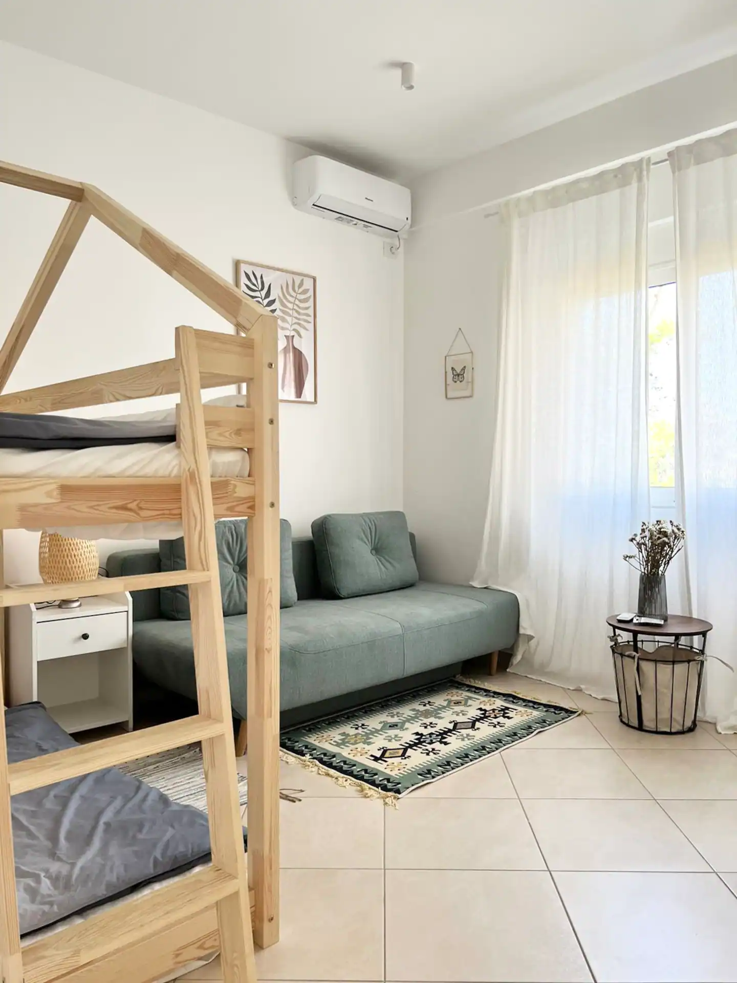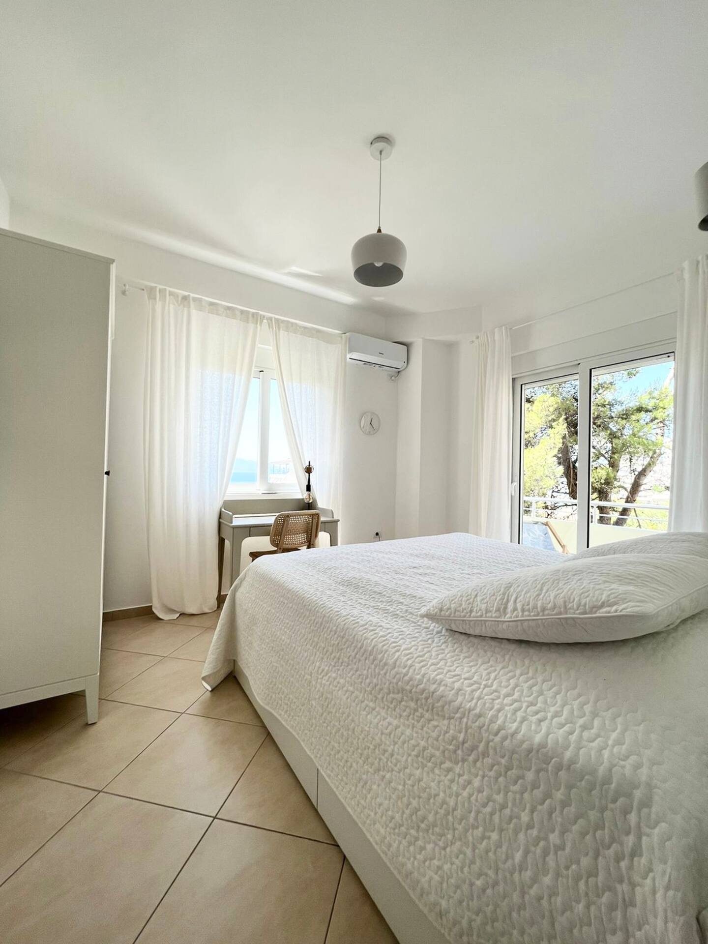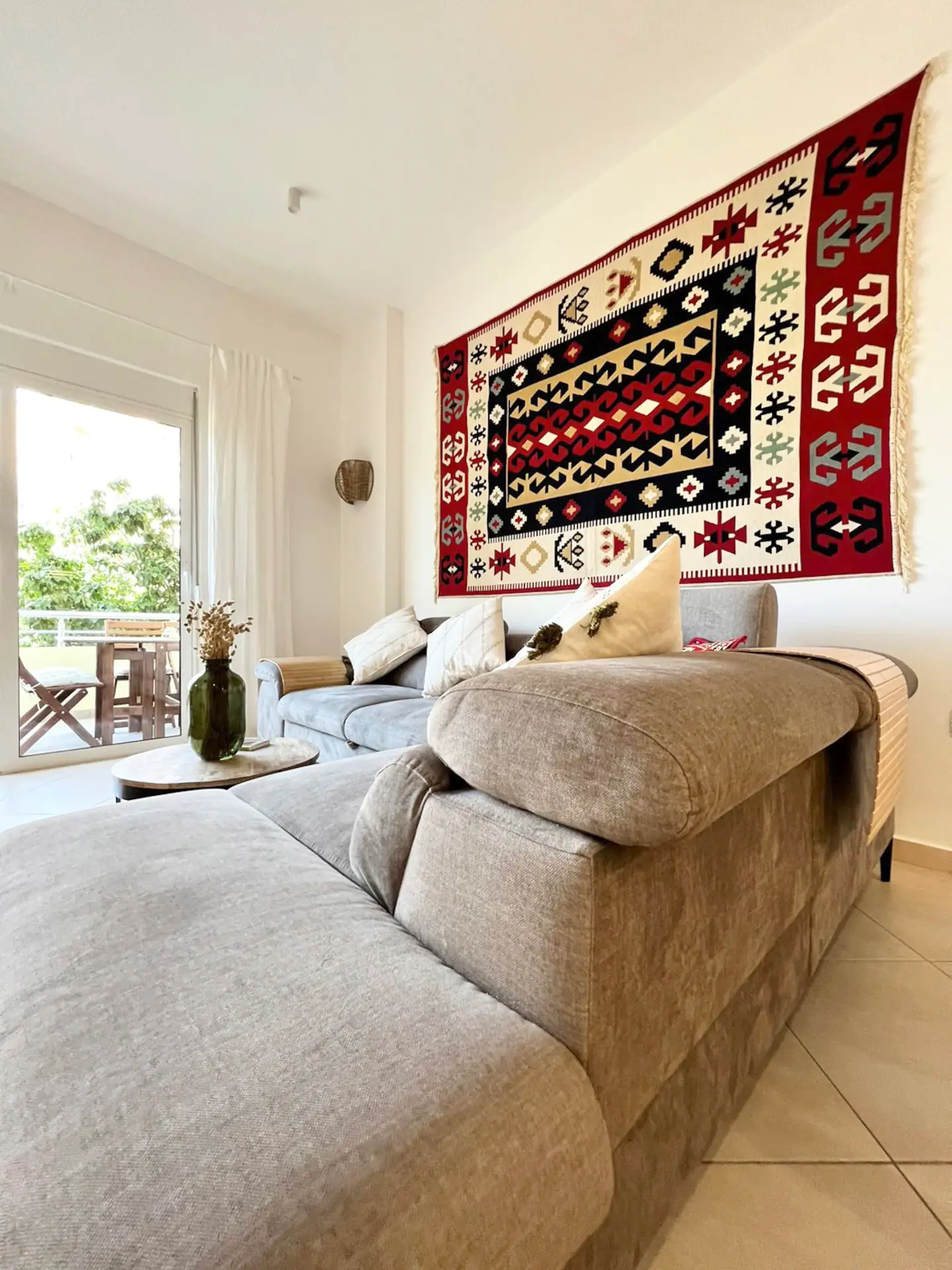 65 metrów to: sypialnia, duży salon z kuchnią, taras, 100 metrów od plaży, piękny widok na morze oraz Korfu i stylowe wnętrze z wieloma lokalnymi dodatkami.